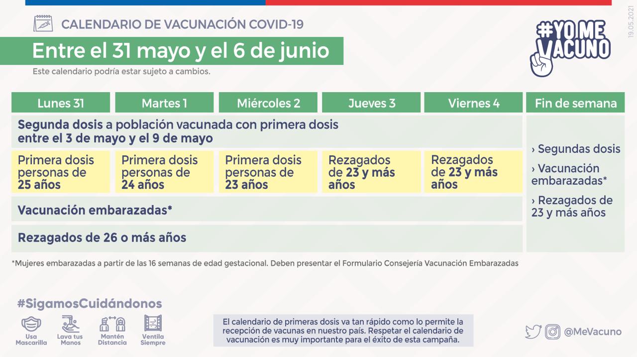 El Ministerio de Salud (Minsal) entregó las fechas de vacunación contra el COVID-19 para la semana del 31 de mayo, fecha en la que se contempla que reciban las dosis las personas sanas entre 25 y 23 años de edad.
