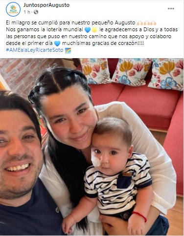 “El milagro se cumplió para nuestro pequeño Augusto. Nos ganamos la lotería mundial ”, dijeron sus padres en la cuenta de Facebook "Juntos por Augusto".